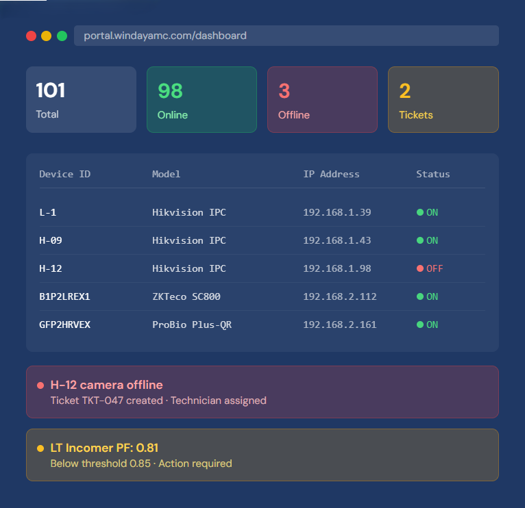 Traditional AMCs are just scheduled visits and reactive repairs. WINDAY AMC is proactive and intelligent. We continuously monitor your devices 24/7 via IP and IoT connectivity. If a camera goes offline or your power factor drops, we know immediately and create a service ticket automatically. You get a live ERP dashboard showing real-time device status, power readings, and service history. It's like having a building management team working around the clock.